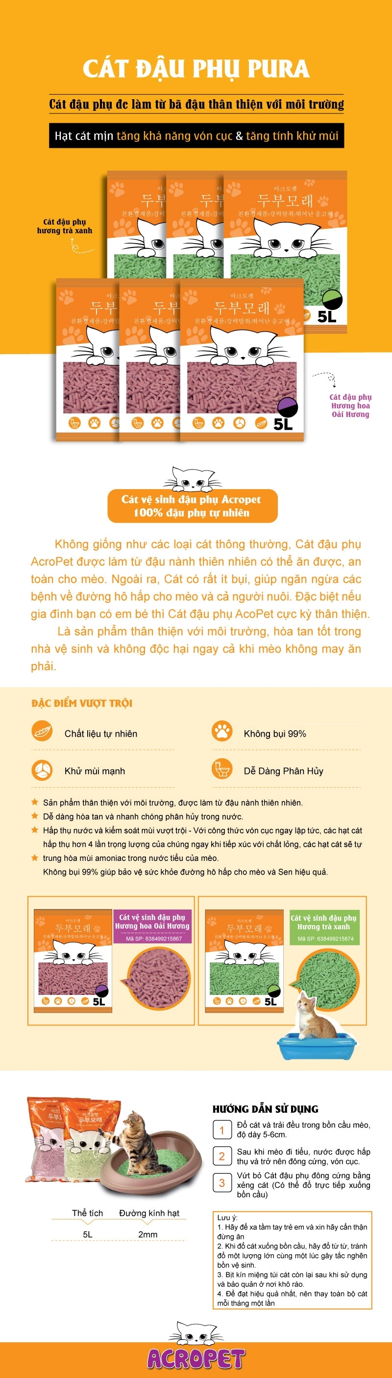 Không giống như các loại cát thông thường, cát đậu nành Acropet được làm từ đậu nành thiên nhiên có thể ăn được, an toàn cho mèo. Ngoài ra, Cát có rất ít bụi, giúp ngăn ngừa các bệnh về đường hô hấp cho mèo và cả người nuôi. Đặc biệt nếu gia đình bạn có em bé thì Cát đậu phụ Pura cực kỳ thân thiện.