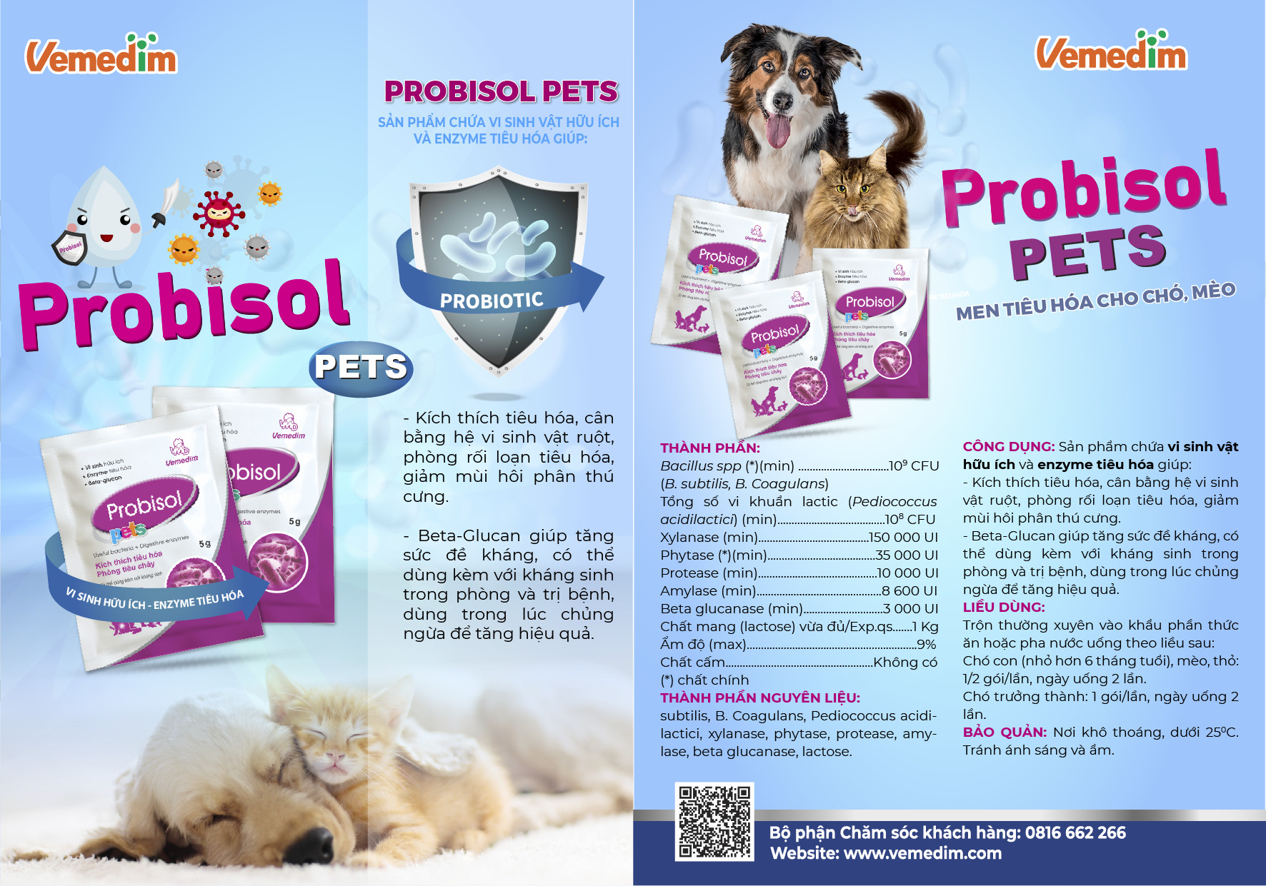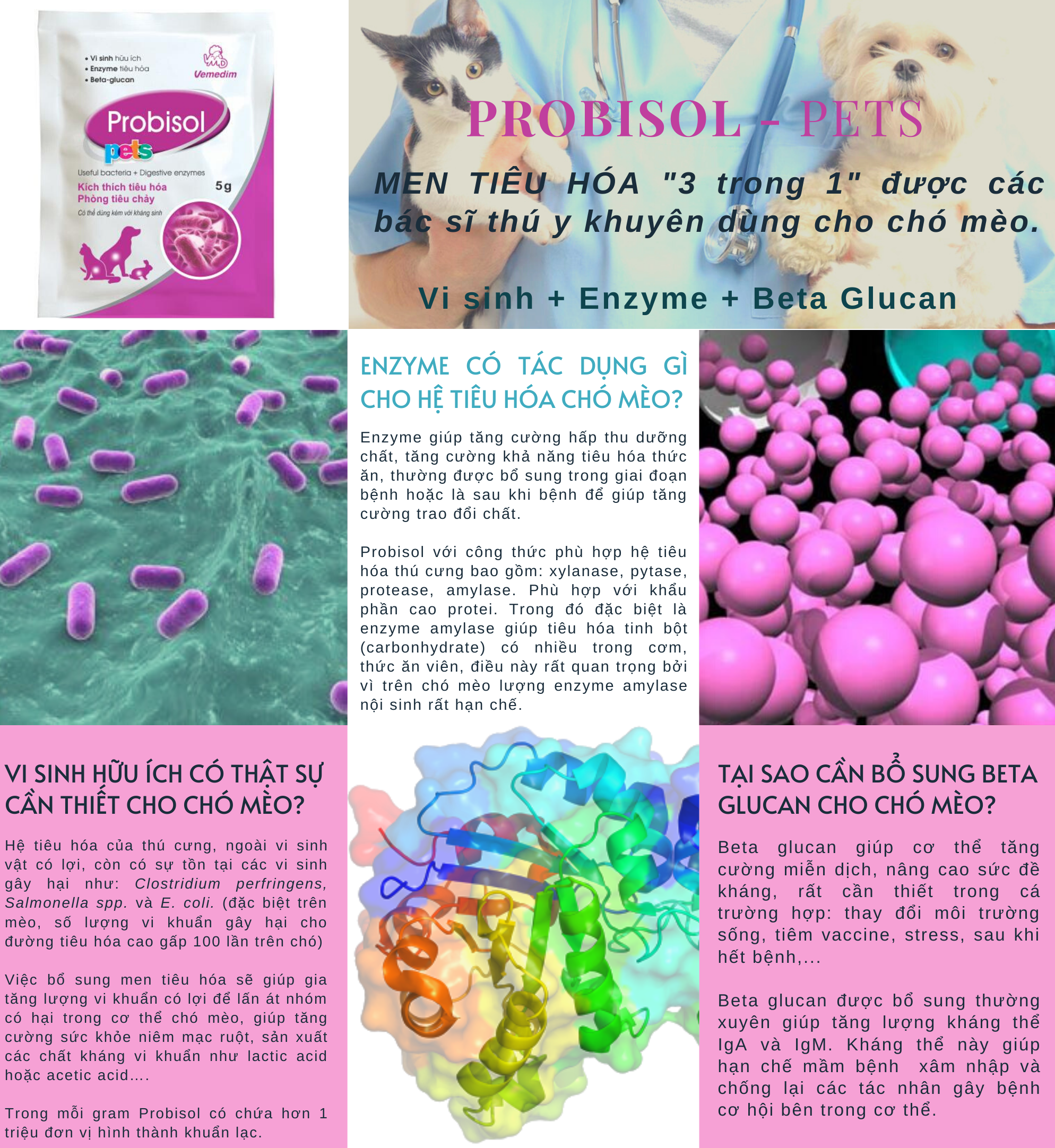 Men tiêu hóa Probisol Pets là sản phẩm có chứa vi sinh vật hữu ích và enzyme tiêu hóa giúp kích thích tiêu hóa, cân bằng hệ vi sinh vật đường ruột, phòng các chứng rối loạn tiêu hóa (như khó tiêu, tiêu chảy, táo bón) và giúp giảm mùi hôi phân.