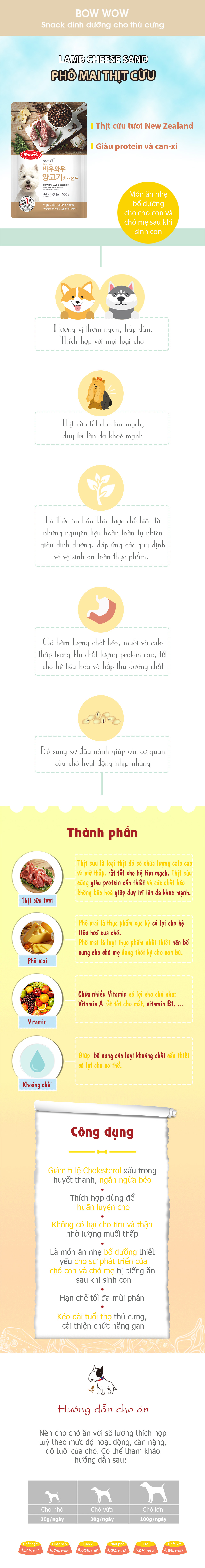 Phô mai thịt cừu Bowwow làm từ thịt cừu tươi New Zealand giàu protein và can-xi, không những là món bánh thưởng hấp dẫn thường dùng trong huấn luyện, mà còn là món ăn nhẹ bổ dưỡng cho chó con và chó miệng biếng ăn sau khi sinh con.