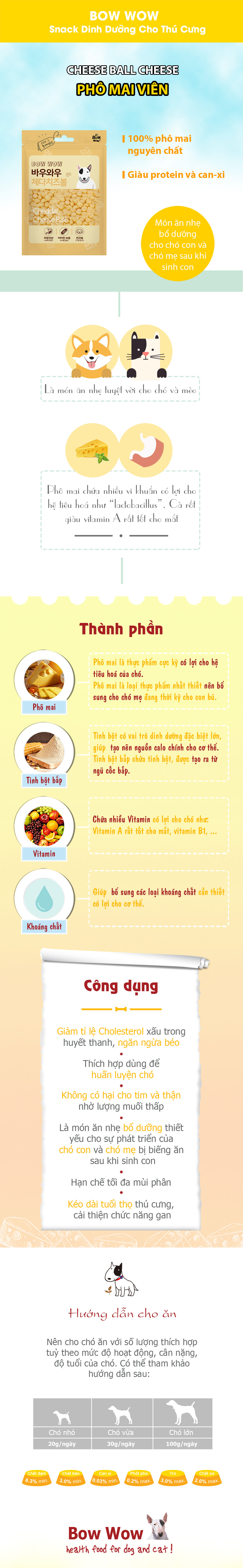 Phô mai viên Bowwow làm từ 100% phô mai nguyên chất, giàu protein và canxi, là món ăn nhẹ bổ dưỡng cho các chú chó, nhất là các chú chó con đang phát triển hệ cơ xương và chó mẹ cần phục hồi thể trạng sau khi sau con. Snack có thể dùng được cho cả chó và mèo.