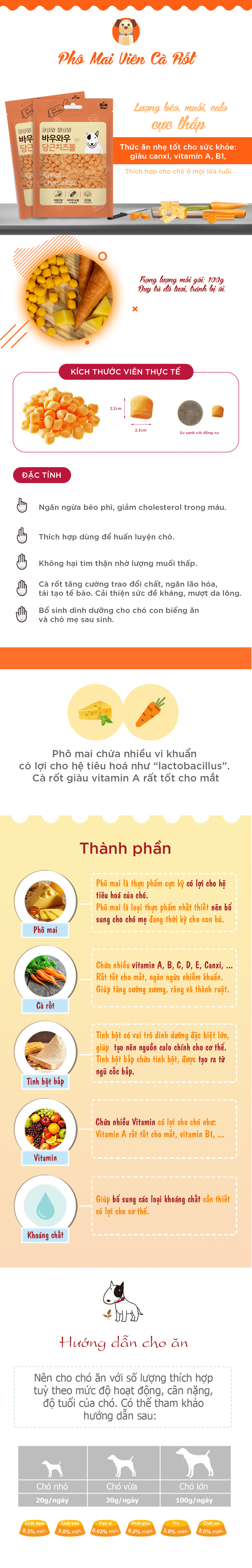 - Thành phần: Phô mai, cà rốt, tinh bột bắp, vitamin, khoáng chất