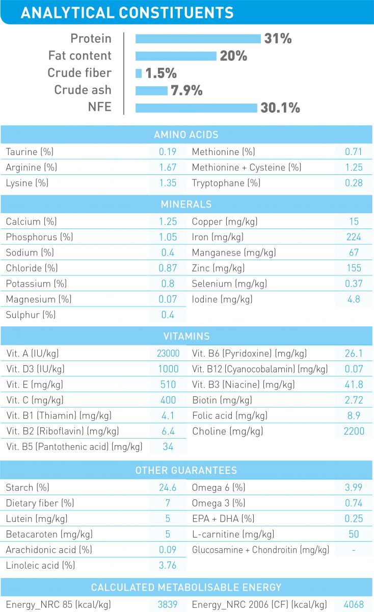 Protein gia cầm, gạo, bắp, chất béo động vật, protein thực vật*, gluten bắp, protein động vật, củ cải đường, khoáng chất, dầu đậu nành, psyllium (1%), fructo-oligo-sacarit, men thủy phân (nguồn manno-oligo-sacarit), chiết xuất men (nguồn betaglucan), chiết xuất cúc vạn thọ (nguồn lutein).
