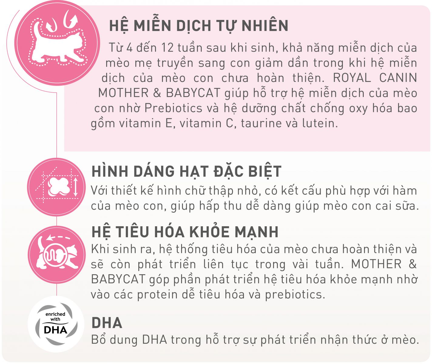 - ROYAL CANIN MOTHER & BABYCAT được thiết kế dành cho mèo mẹ đang mang thai, trong thời gian cho con bú và mèo con từ 1-4 tháng tuổi.