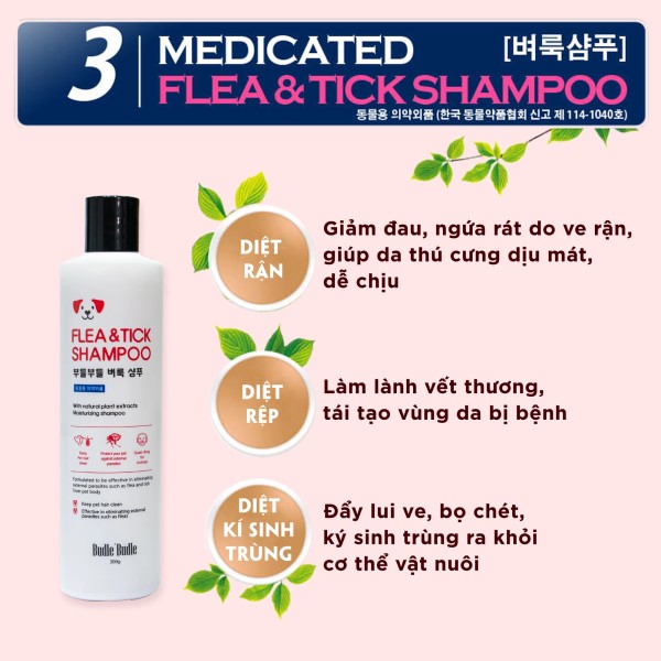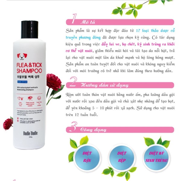 Dầu gội trị ve cho chó Budle’Budle Flea & Tick Shampoo thuộc dòng sản phẩm dầu gội đặc trị các bệnh về da cho chó. Sự kết hợp độc đáo từ 17 loại thảo dược cổ truyền phương Đông đã được lựa chọn kỹ càng, có tác dụng hiệu quả trong việc đẩy lùi ve và bọ chét, điều trị các bệnh về da do ve rận, giảm thiểu mùi hôi và tái tạo da nổi bật, trả lại cho thú cưng một làn da khỏe mạnh và bộ lông bóng mượt.