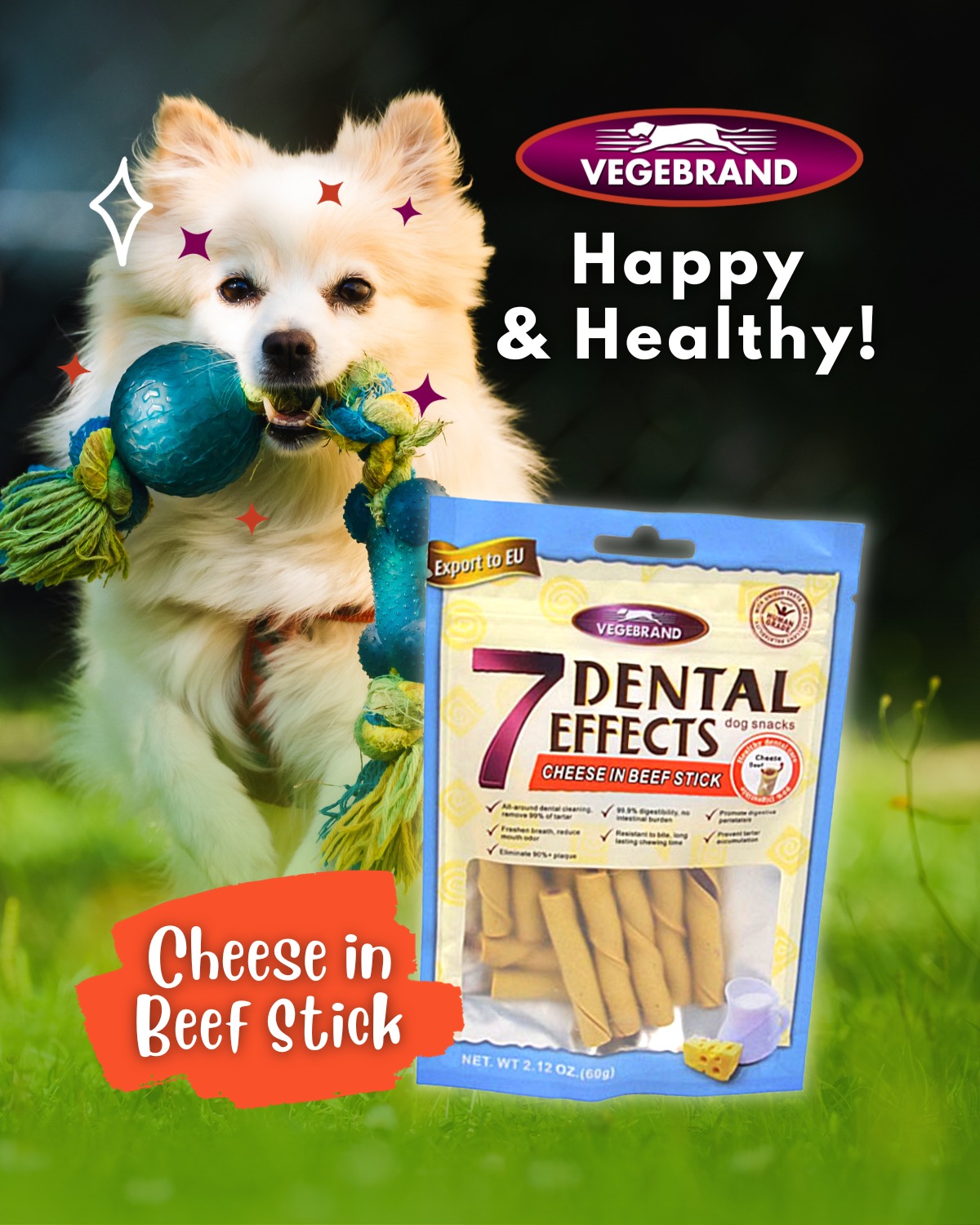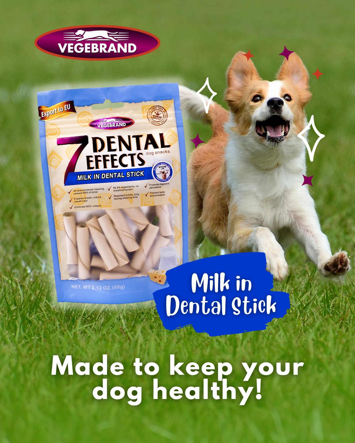 Xương que ngắn 7 Dental Effects với độ dai phù hợp cho thời gian nhai lâu, giúp loại bỏ hành vi cắn phá đồ đạc hiệu quả. Xương gặm cũng giúp massage nướu và loại bỏ cao răng. Xương que ngắn 7DE với hương vị phô mai và sữa thơm ngon hấp dẫn giúp cho cún cưng của bạn ăn ngon miệng hơn, thúc đẩy sự thèm ăn. Xương gặm cũng có thể thiêu hóa hoàn toàn và không gây hại cho đường ruột của chó.