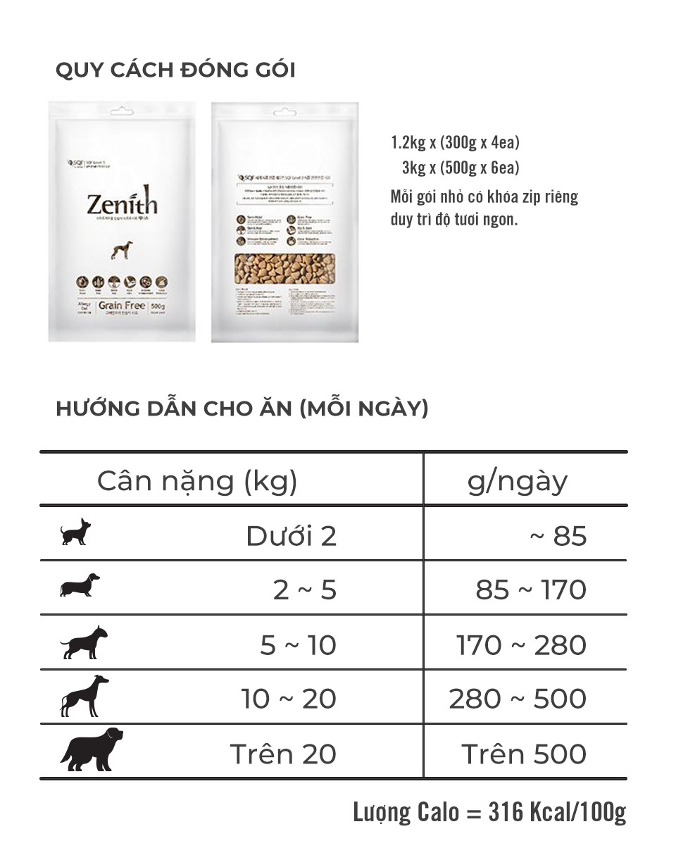 Thức ăn hạt mềm chó con Zenith Puppy không chứa ngũ cốc như các các loại đậu giá rẻ, bắp, lúa mì… nguyên nhân chính gây dị ứng và khó tiêu ở các chú chó. Bột dừa, chất xơ, các vitamin và khoáng chất được thêm vào để ức chế sự tăng trưởng của vi sinh vật đường ruột có hại và ngăn chặn tiêu chảy.